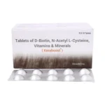 Keraboost tablet is a nutritional supplement containing vitamins, minerals, and N-acetyl L-cysteine that nourishes and strengthens hair. It is used to reduce hair fall, premature greying of hair, and promote hair growth. It improves hair growth by increasing blood flow to the roots. Also, it nourishes hair follicles by providing essential nutrients. Biotin helps to create red blood cells that carry nutrients and oxygen to the hair follicles and scalp. Zinc helps in the proper functioning of oil glands around the hair follicles.